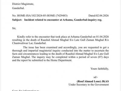 इस आदेश में कहा गया है कि कृपया 01.04.2026 को अरहामा गंदरबल में हुए एनकाउंटर के संदर्भ में, जिसमें राशिद अहमद मुगल पुत्र स्वर्गीय गुल जमान मुगल, निवासी चुंटवालीवार लार, गंदरबल की मौत हो गई थी के मामले को गंभीरता से लें और जांच करें। आदेश में कहा गया है कि इस मामले की जांच की गई है।