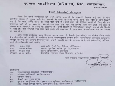 विश्व साइकिल दिवस पर ही देश की बड़ी साइकिल कंपनी एटलस साइकिल्स (हरियाणा) ने खड़े किए हाथ. कंपनी का कहना है कि उसके पास फंड खत्म हो चुका है. कंपनी के गेट पर चिपकाया बैठकी (ले ऑफ) का नेटिस. साहिबाबाद यूनिट में 1 हज़ार कर्मचारी काम करते हैं.