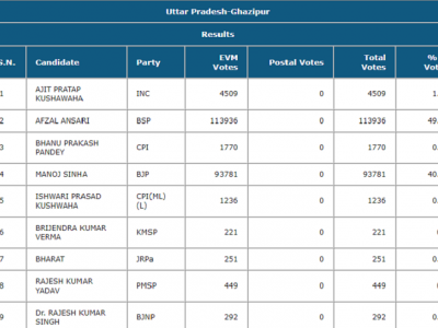 दोपहर 04.30 बजे तक अफजाल अंसारी को 408468 वोट मिले हैं। वहीं मनोज सिन्हा को 329349 वोट मिले हैं।
