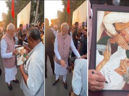 उन्होंने उस तस्वीर को ले लिया और वे वहां से जाने लगे तभी उस शख्स ने उन्हें फिर से रोका और उसी फोटो का एक छोटा तस्वीर लेकर आया और पीएम मोदी का ऑटोग्राफ मांगने लगा। ऐसे में पीएम मोदी ने उस शख्स के तस्वीर पर ऑटोग्राफ दिया और वहां से चले गए।