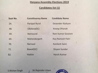 हरियाणा में इसी साल होने वाले विधानसभा चुनाव के मद्देनजर जन नायक जनता पार्टी (जेजेपी) ने अपने उम्मीदवारों की पहली लिस्ट जारी कर दी है। इसके तहत पहले 7 उम्मीदवारों की घोषणा की गई है। देवेंद्र कादियान को पानीपत देहात से टिकट दिया गया है जबकि कमलेश सैनी को नारनौल से पार्टी ने चुनाव में खड़ा करने का फैसला किया है। इसके अलावा अनूप धनक को उकलाना से टिकट दिया गया है। महेंद्रगढ़ से राव रमेश जन नायक जनता पार्टी की ओर से चुनावी मैदान में होंगे। हर्ष कुमार जेजेपी के हथीन से उम्मीदवार होंगे।