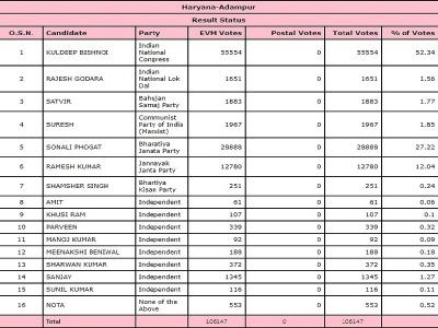 आदमपुर सीट पहले से ही बिश्नोई का गढ़ मानी जाती रही है। पिछले 11 बार से यहां बिश्नोई परिवार जीत हासिल करती रही है लेकिन बीजेपी से सोनाली को मिले टिकट से मुकाबला दिलचस्प हो गया था। सोनाली फोगाट हरियाणा के हिसार जिले में संत नगर की हैं। वे अपने टिकटॉक वीडियो को लेकर काफी चर्चित रही हैं। सोनाली हरियाणा में बीजेपी की महिला मोर्चा के साथ भी काम कर चुकी हैं।