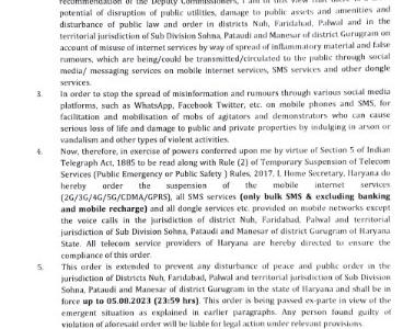हरियाणा सरकार ने नूंह के अलावा, फरीदाबाद, पलवल, गुरुग्राम के उप-मंडल सोहना, पटौदी और मानेसर के इलाके में 5 अगस्त तक मोबाइल इंटरनेट और एसएमएस सेवाएं बंद करने का फैसला किया है।