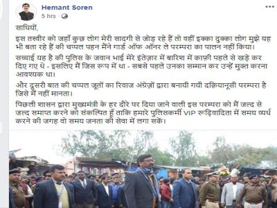झामुमो के कार्यकारी अध्यक्ष व झारखंड के नए मुख्यमंत्री हेमंत सोरेन की एक तस्वीर वायरल हो रही थी, जिसमें कहा जा रहा था कि उन्होंने गार्ड ऑफ ऑनर की परम्परा का पालन नहीं किया। इसके बाद सीएम हेमंत सोरेन ने अपनी उस तस्वीर को फेसबुक पर शेयर करते हुए सच्चाई बयां की है।