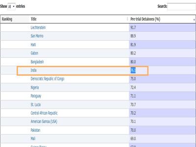 वर्ल्ड प्रिजन ब्रीफ (WPB) रिपोर्ट के मुताबिक वैश्विक स्तर पर विचाराधीन कैदियोंं के मामले में भारत 76.1 % के साथ 6वें नंबर पर है, जबकि लिकटेंस्टीन (91.7%) सूची में पहले स्थान पर है। वहीं सैन मैरिनो (88.9%), दूसर स्थान पर तो हैती (81.9%) तीसरे, गैबॉन (80.2%) चौथे और बांग्लादेश (80%) पांचवें स्थान पर मौजूद हैं। इस सूची में पाकिस्तान की स्थिति भारत से अच्छी है। पाकिस्तान 70 फीसदी के साथ 13वें स्थान पर है।