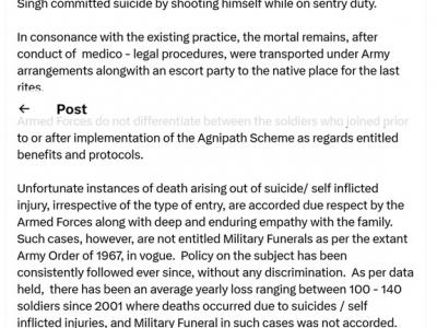 सेना ने एक्स पर लिखा है कि आत्महत्या अथवा स्वयं को लगी चोट के कारण होने वाली मृत्यु की दुर्भाग्यपूर्ण घटनाओं या फिर प्रवेश के प्रकार की परवाह किए बिना सशस्त्र बलों द्वारा परिवार के साथ गहरी और स्थायी सहानुभूति के साथ-साथ उचित सम्मान दिया जाता है। हालांकि ऐसे मामले प्रचलित 1967 के मौजूदा सेना आदेश के अनुसार सैन्य अंत्येष्टि के हकदार नहीं हैं।