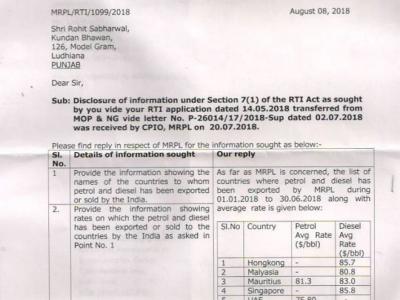 आरटीआई कार्यकर्ता रोहित सभरवाल के मुताबिक सरकारी मालिकाना हक वाली मैंगलोर रिफाइनरी और पेट्रोकेमिकल्स लिमिटेड ने 1 जनवरी 2018 से 30 अप्रैल 2018 के बीच 29 देशों को रिफाइंड पेट्रोलियम उत्पादों का निर्यात किया। पेट्रोल की दर 32-34 रुपये प्रति लीटर और डीजल 34-36 रुपये प्रति लीटर की दर से निर्यात किया गया।