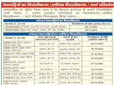 दरअसल, हाल में संसद में पास हुए कृषि कानूनों को लेकर कई जगहों पर विरोध जारी है। खासकर उत्तर भारत में इसका प्रभाव ज्यादा है। किसान संगठन कई जगहों पर रेल रोको आंदोलन कर रहे हैं, जिस वजह से ट्रेनों को चलाने में दिक्कत आ रही है।