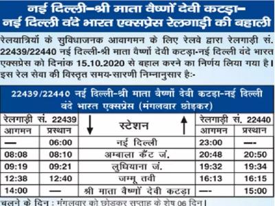 भारतीय रेलवे के अनुसार नई दिल्ली-श्री माता वैष्णो देवी कटड़ा-नई दिल्ली वंदे भारत एक्सप्रेस ट्रेन (22439/22440) मंगलवार को छोड़कर हफ्ते के 6 दिन चलेगी। यही व्यवस्था पहले भी थी।