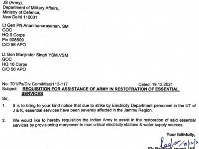 जम्मूः जम्मू-कश्मीर में भयानक सर्दी के बीच शून्य से नीचे के तापमान में बिजली विभाग के 22 हजार कर्मचारियों की बेमियादी हड़ताल से मचे हाहाकार के बाद बिजली व पानी की आपूर्ति बहाल करने के लिए सेना की मदद मांगी गई है।