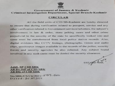 सर्कुलर में साफ तौर पर कहा गया है कि यदि किसी व्यक्ति की पासपोर्ट बनवाने, सरकारी नौकरी या फिर किसी सरकारी योजना से जुड़े मामले में सिक्योरिटी क्लियरेंस की रिपोर्ट को तैयार किया जाए तो उसमें यह भी देखा जाना चाहिए कि वह व्यक्ति पत्थरबाजी, कानून व्यवस्था भंग करने या फिर किसी अन्य अपराध में तो शामिल नहीं रहा है। यदि व्यक्ति इनमें लिप्त पाया जाए तो उसे सिक्योरिटी क्लियरेंस नहीं दिया जाना चाहिए।