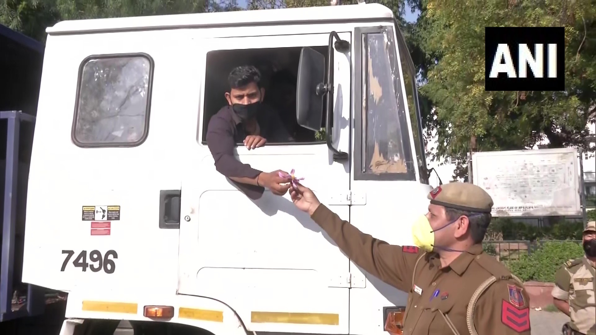 दिल्ली पुलिस लोगों को फूल देकर घर में रहने का सलाह दे रही है (एएनआई फोटो)
