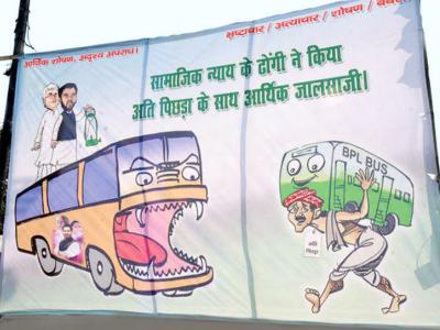 इस पोस्टर में बस को किसी राक्षस की तरह दिखाया गया है, जिस पर तेजस्वी और लालू प्रसाद यादव खड़े दिखाई पड़ रहे हैं. पोस्टर के जरिये अति पिछड़ा की राजनीति को गरमाते हुए उस अतिपिछड़ा व्यक्ति को भी दर्शाया गया है, जो बीपीएल सूची में होते हुए बस का मालिक बताया गया था. जदयू ने इसे अतिपिछड़ा के साथ आर्थिक जालसाजी बताया है. उल्लेखनीय है कि पिछले दिनों जदयू नेता नीरज कुमार ने बस का खुलासा करते हुए बीपीएल सूचि के व्यक्ति को बस का मालिक होने का खुलासा किया था.