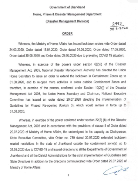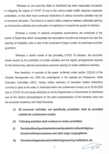 Government of Jharkhand orders extension of lockdown related restrictions currently in place in the state within the containment zones up to September 30 due to #COVID19. pic.twitter.com/oyhEXF5NAU