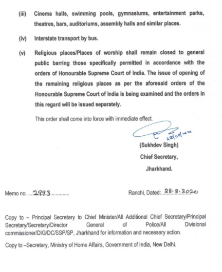 झारखंड में सिनेमा हॉल, स्वीमिंग पुल, इंटरटेनमेंट पार्क, धार्मिक और पॉलिटिकल आयोजन को अनुमति नहीं दी गई है।