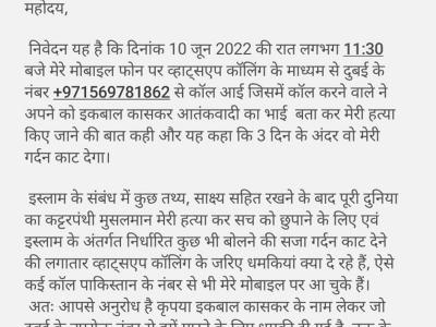 जितेंद्र त्यागी के मुताबिक 10 जून को रात साढ़े 11 बजे वाटसेप कॉल के जरिए दुबई से काल कर धमकी दी गई। त्यागी ने आतंकवादी इकबाल कासकर के भाई पर आरोप लगाया है। उन्होंने यूपी सीएम को लिखे पत्र में कहा है कि कासकर के भाई ने 3 दिन के अंदर गर्दन काटने की धमकी दी है।