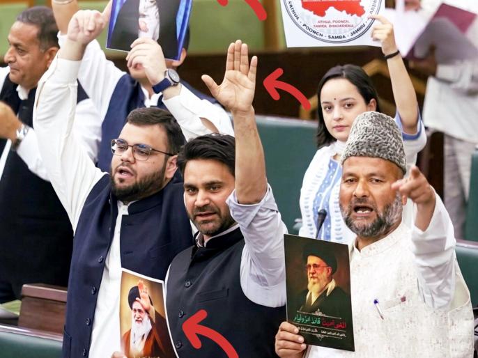 उमर अब्दुल्ला की नेशनल कांफ्रेंस और महबूबा मुफ्ती की पीपल्स डेमोक्रेटिक पार्टी के विधायकों ने सदन में इजरायल मुर्दाबाद के नारे लगाए। इसी के साथ, ईरान के पूर्व सुप्रीम लीडर खामेनेई के बैनर भी लहराए गए। वहीं भारतीय जनता पार्टी विधायकों ने नेशनल ला यूनिवर्सिटी के बैनर लहराए। विधानसभा के वेल में विधायकों ने खामेनेई की तस्वीर लेकर प्रदर्शन किया।