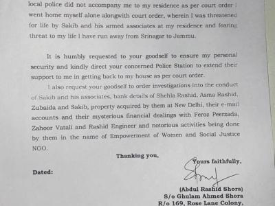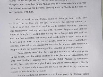 पुलिस महानिदेशक को लिखे गए पत्र में अपनी बेटी पर आरोप लगाया कि शेहला रशीद देश विरोधी गतिविधियों में शामिल है। डीजीपी को संबोधित 3 पन्नों का पत्र अंग्रेजी में लिखा गया है।