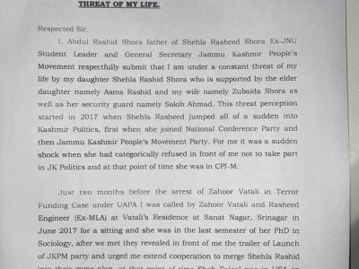 शेहला रशीद के पिता अब्दुल राशिद शोरा ने पत्र में लिखा है कि उन्हें डर लग रहा है। बेटी से जान का खतरा है। डीजीपी को पत्र लिखकर कई आरोप लगाए हैं। पुलिस महानिदेशक को लिखे गए पत्र में अपनी बेटी पर आरोप लगाया कि शेहला रशीद देश विरोधी गतिविधियों में शामिल है। डीजीपी को संबोधित 3 पन्नों का पत्र अंग्रेजी में लिखा गया है।