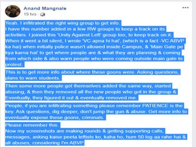 उसने वॉट्सऐप का चैट फेसबुक पर शेयर करते हुए कहा, 'मैंने लिखा 'वीसी अपना है' (जोकि एक तथ्य है कि वीसी ABVP का ही है), जब शुरू में पुलिस को कैंपस के अंदर जाने की अनुमति नहीं थी, मेन गेट पर क्या करना है, लोगों तक पहुँचने के लिए वे क्या कर रहे हैं और किस योजना से और किस तरफ से आ रहे हैं तथा उन लोगों को भी चेतावनी दी जो विरोध करने के लिए मुख्य दरवाजे के बाहर आ रहे थे।