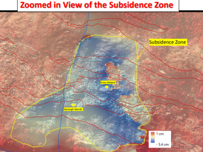 एनआरएससी ने कहा कि पिछले सप्ताह दिसंबर और जनवरी के पहले सप्ताह के बीच तेजी से धंसने की घटना शुरू हुई थी। सेटेलाइट तस्वीरों से पता चलता है कि आर्मी हेलीपैड और नरसिंह मंदिर सहित सेंट्रल जोशीमठ में सबसिडेंस जोन स्थित है। धंसाव का ताज जोशीमठ-औली रोड के पास 2,180 मीटर की ऊंचाई पर स्थित है। जोशीमठ को चमोली जिला प्रशासन द्वारा भू-धंसाव क्षेत्र घोषित कर दिया गया है क्योंकि सैकड़ों घरों में कुछ दिनों के भीतर दरारें आ गईं और परिवारों को स्थानांतरित करना पड़ा क्योंकि उनके घरों को खतरनाक के रूप में पहचाना गया है।