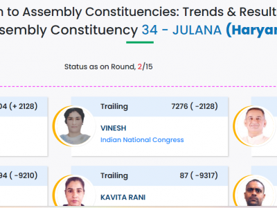 Julana seat Haryana Assembly Election Result 2024:हरियाणा के जींद जिले की जुलाना विधानसभा सीट से कांग्रेस उम्मीदवार और पहलवान विनेश फोगाट शुरुआती रुझानों में पीछे हैं।फोगाट अपने निकटतम प्रतिद्वंद्वी भारतीय जनता पार्टी (भाजपा) के उम्मीदवार योगेश कुमार से 2128 मतों से पीछे हैं। हरियाणा में पांच अक्टूबर को हुए विधानसभा चुनाव के लिए मतों की गिनती मंगलवार सुबह आठ बजे शुरू हो गई।
