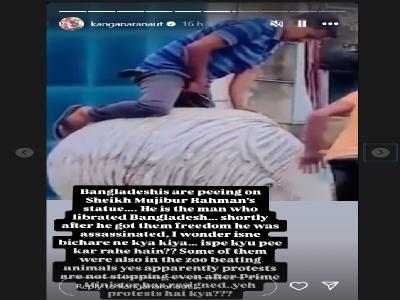 कंगना ने अपने इंस्टाग्राम अकाउंट पर रहमान की प्रतिमा पर पेशाब करने वाले एक व्यक्ति का घिनौना वीडियो शेयर किया, जिन्हें बांग्लादेश का संस्थापक पिता माना जाता है।