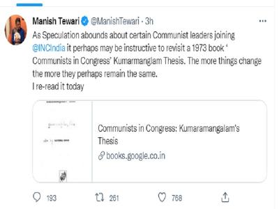 हालाँकि कन्हैया के कांग्रेस में शामिल होने पर कुछ कांग्रेसी नाराज भी हैं। कांग्रेस नेता मनीष तिवारी ने कम्युनिस्टों के कांग्रेस में शामिल होने को लेकर ट्विटर पर तंज किया है। माना जा रहा है कि उनका निशाना कन्हैया कुमार और जिग्नेश मेवानी पर ही है।