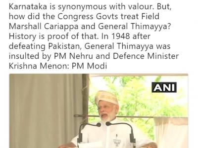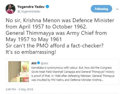 योगेंद्र यादव ने अपने ट्वीट में समाचार एजेंसी एएनआई का समाचार नत्थी किया था जिसके अनुसार पीएम मोदी ने अपने भाषण में कहा, "कर्नाटक साहस का प्रतीक है। लेकिन कांग्रेस सरकारों ने फील्ड मार्शल करियप्पा और जनरल थिमैया के संग कैसा बरताव किया? इतिहास इसका गवाह है। 1948 में पाकिस्तान को हराने के बाद जनरल थिमैया का पीएम नेहरू और रक्षा मंत्री कृष्णा मेनन ने अपमान किया था।"