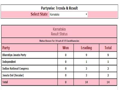 बीजेपी 11 सीटों पर आगे। दो सीट पर कांग्रेस जबकि एक सीट पर जेडीएस आगे है। निर्दलीय को एक सीट पर बढ़त।