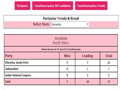 कर्नाटक उपचुनाव: सभी 15 सीटों के रुझान आ गये हैं। चुनाव आयोग के आंकड़ों के अनुसार बीजेपी 10 सीटों पर आगे चल रही है। वहीं, कांग्रेस और जेडीएस 2-2 सीट पर आगे हैं। एक सीट पर निर्दलीय को बढ़त।