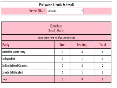 चुनाव आयोग के अनुसार आठ सीटों के रुझान आये। बीजेपी 4 सीटों पर आगे, कांग्रेस 2 सीटों पर आगे। एक पर निर्दलीय जबकि एक पर जेडीएस को बढ़त।