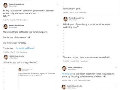 कर्नाटकः 10वीं की पाठ्यपुस्तकों में बदलाव को लेकर घिरे कर्नाटक पाठ्यपुस्तक समीक्षा समिति के प्रमुख रोहित चक्रतीर्थ पोर्न पर किए अपने पुराने ट्वीट्स को लेकर विवादों आ गए हैं। मामला साल 2014 और 2015 का है जब रोहित चक्रतीर्थ ने पोर्न पर कई ट्वीट किए थे जो अब वायरल हो रहे हैं। एक यूजर ने बुधवार को रोहित के विवादित ट्वीट का स्क्रीनशॉट साझा करते हुए इसकी तरफ लोगों का ध्यान खींचा।