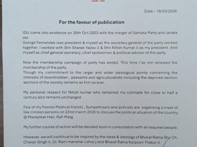 एक विस्तृत पत्र में, त्यागी ने पार्टी की शुरुआत को याद करते हुए बताया कि जेडीयू का गठन 30 अक्टूबर, 2003 को जॉर्ज फर्नांडिस के नेतृत्व में समता पार्टी और जनता दल के विलय के बाद हुआ था।