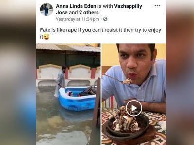 केरल से कांग्रेस सांसद हिबी ईडन की पत्नी अन्ना का फेसबुक पोस्ट सोशल मीडिया पर वायरल हो गया है। अन्ना लिंडा ईडन ने अपने फेसबुक अकाउंट पर एक पोस्ट में किस्मत की तुलना रेप से की है। अन्ना लीना ईडन ने कोच्चि में सोमवार को बारिश के बाद आई बाढ़ के दौरान अपनी बेटी और पति ईडन की दशा बताने के लिए फेसबुक पर पोस्ट किए गए दो वीडियो क्लिप के साथ लिखा, “किस्मत बलात्कार के समान है, अगर आप इसे रोक नहीं सकते, तो इसका आनंद लेने की कोशिश करें।”