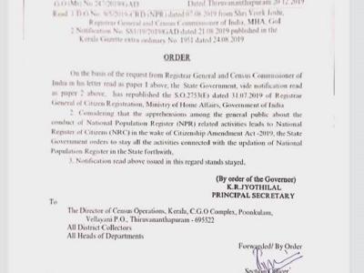 मुख्यमंत्री पिनाराई विजयन के कार्यालय से एक आधिकारिक बयान में कहा गया, ''जनगणना के संचालन के लिए अपना सहयोग जारी रखने के लिए सरकार कर्तव्य-बद्ध है, क्योंकि उसे टाला नहीं जा सकता है। राज्य में एनपीआर से संबंधित गतिविधियों को रोकने का फैसला उन तथ्यों की पृष्ठभूमि को देखते हुए लिया गया कि यह मुद्दा सर्वोच्च न्यायालय के समक्ष है और संशोधित नागरिकता अधिनियम संवैधानिक मूल्यों से भटक गया है।''