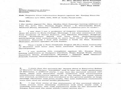 इसके अलावा डॉक्टर मेधा ने अपनी शिकायत में आगे कहा है कि आरोपी संजय राउत के दिये बयान से सिद्ध होता है कि वो बा-इरादतन बिना किसी सबूत के उसका और उनके परिवार का चरित्र हनन करते उन्हें डराना, धमकाना चाहते हैं।