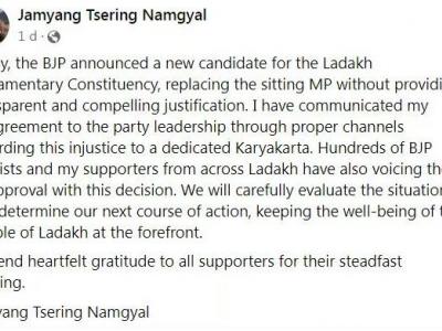 इसी तरह सोशल मीडिया पर पोस्ट करते हुए लिखा भाजपा ने लद्दाख लोकसभा सीट से नया उम्मीदवार घोषित किया और मौजूदा सांसद का टिकट काट दिया, लेकिन इस बीच नए उम्मीदवार को लेकर कोई भी पारदर्शिता नहीं दिखाई गई या ये निर्णय किसी भी तरह का न्याय नहीं है।