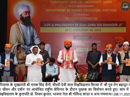 चंडीगढ़ःहरियाणा के मुख्यमंत्री श्री नायब सिंह सैनी ने कहा कि हिंद की चादर श्री गुरु तेग बहादुर जी का जीवन संपूर्ण मानवता के लिए प्रेरणा का स्रोत है। उन्होंने कहा कि श्री गुरु तेग बहादुर जी ने 17वीं शताब्दी में अन्याय, अत्याचार और दमन के विरुद्ध जो त्याग और बलिदान दिया, वह न केवल सिख इतिहास बल्कि पूरी मानव सभ्यता का सबसे ऊँचा आदर्श है। मुख्यमंत्री श्री नायब सिंह सैनी शनिवार को चौधरी देवी लाल विश्वविद्यालय, सिरसा में आयोजित “श्री गुरु तेग बहादुर जी के जीवन और दर्शन” विषय पर आयोजित राष्ट्रीय सेमिनार में मुख्य अतिथि के रूप में बोल रहे थे।