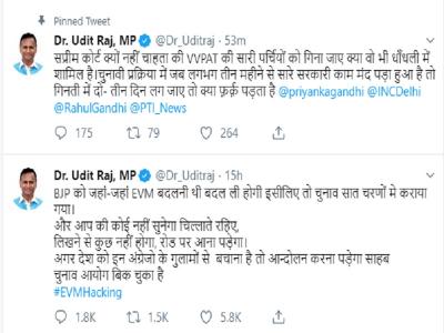 बीजेपी से नाराजगी जताते हुए कांग्रेस में शामिल हुए उदित राज ने ईवीएम विवाद पर सुप्रीम कोर्ट को लेकर विवादित टिप्पणी की है। उदित राज ने ट्वीट कर सुप्रीम कोर्ट पर सवाल उठाते हुए कहा कि 'एससी क्यों नहीं चाहता कि VVPAT की सारी पर्चियों को गिना जाए क्या वो भी धाँधली में शामिल है।' उदित ने इस ट्वीट में प्रियंका गांधी, कांग्रेस और पार्टी के अध्यक्ष राहुल गांधी को भी टैग किया है।