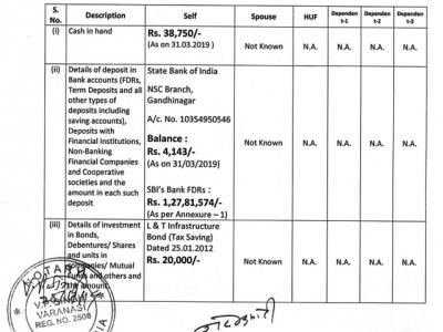 पीएम नरेंद्र मोदी ने काल भैरव के दर्शन के बाद वाराणसी लोकसभा सीट से पर्चा भर दिया। नामांकन के दौरान पीएम मोदी ने हलफनामा दायर किया, जिसमें शिक्षा, परिवार और संपत्ति का ब्यौरा दिया। प्रधानमंत्री नरेंद्र मोदी के पास 38,750 रुपये का कैश मौजूद है।