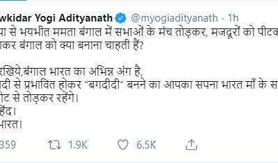 अपने अधिकारिक ट्विटर हैंडल पर ट्वीट करते हुए सीएम योगी मे लिखा, ''भाजपा से भयभीत ममता बंगाल में सभाओं के मंच तोड़कर, मजदूरों को पीटकर,रैलियां रद्द करवाकर बंगाल को क्या बनाना चाहती हैं? याद रखिये,बंगाल भारत का अभिन्न अंग है, बगदादी से प्रभावित होकर "बगदीदी" बनने का आपका सपना भारत माँ के सच्चे सपूत वोट की चोट से तोड़कर रहेंगे। जय हिंद। जय भारत।''