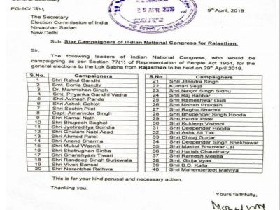कांग्रेस ने लोकसभा चुनाव के लिए राजस्थान में अपने स्टार प्रचारकों की लिस्ट जारी कर दी, जिसमें पार्टी के राष्ट्रीय अध्यक्ष राहुल गांधी व महासचिव प्रियंका गांधी समेत चालीस नेताओं के नाम शामिल हैं। वहीं, कांग्रेस ने सूची में छठवें नंबर पर मुख्यमंत्री अशोक गहलोत और सातवें नंबर पर पार्टी प्रदेशाध्यक्ष व उप मुख्यमंत्री सचिन पायलट को जगह दी है।