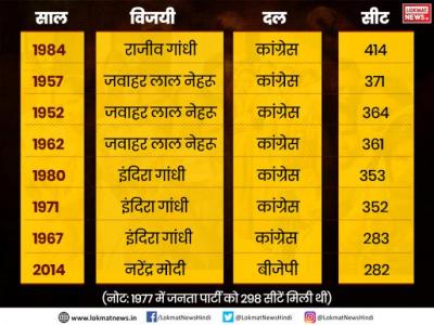 पीएम मोदी के नेतृत्व में पहली बार भारतीय जनता पार्टी (बीजेपी) ने 300 सीटों का आंकड़ा पार किया है। जवाहर लाल नेहरू और इंदिरा गांधी के बाद प्रधानमंत्री नरेंद्र मोदी ऐसे तीसरे पीएम बन गए हैं जिन्होंने अपने नेतृत्व में लगातार दूसरी बार पार्टी को बहुमत दिलाया।