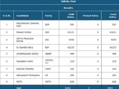 ओडिशा की पुरी लोकसभा सीट पर बीजेपी प्रवक्ता संबित पात्रा और कांग्रेस के वरिष्ठ नेता पिनाकी मिश्र के बीच कड़ी टक्कर देखने को मिल रही है। चुनाव आयोग के आंकड़ों के अनुसार गुरुवार दोपहर 12.15 मिनट तक संबित पात्रा को कुल 43225 वोट मिल चुके थे। वहीं पिनाकी मिश्र को 43121 वोट मिले थे।