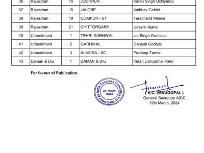 कांग्रेस महासचिव केसी वेणुगोपाल ने कहा कि हमने लोकसभा चुनाव के लिए अपने उम्मीदवारों की पहली सूची पहले ही घोषित कर दी थी। आज हमने दूसरी सूची की घोषणा की। असम, मध्य प्रदेश और राजस्थान के 43 प्रत्याशियों की घोषणा की। गौरव गोगोई असम के जोरहाट से उम्मीदवार होंगे और मध्य प्रदेश के छिंदवाड़ा से नकुलनाथ को टिकट मिला है।