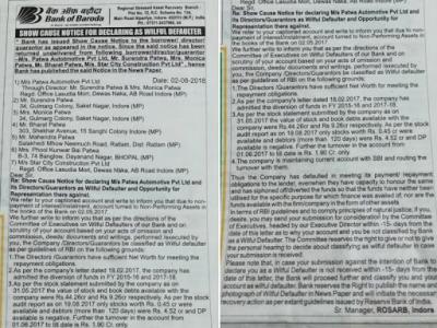 इंदौर, 14 अगस्त: बैंक ऑफ बड़ौदा ने मंगलवार को मध्यप्रदेश के पर्यटन मंत्री सुरेंद्र पटवा और उनकी कंपनी पटवा ऑटोमेटिव को विलफुल डिफॉल्टर घोषित के लिए नोटिस जारी किया है। इस बात की जानकरी सार्वजानिक करने के लिए बैंक ने अखबारों में विज्ञापन भी जारी किया है। नोटिस में पटवा ऑटोमोटिव प्राइवेट लिमिटेड के डायरेक्टर्स सुरेंद्र पटवार, मोनिका पटवा, भारत पटवा, महेंद्र पटवा और फूलकुंवर पटवा का नाम भी शामिल है।