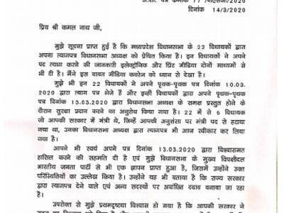 बता दें कि हाल में ज्योतिरादित्य सिंधिया और 22 विधायकों ने कांग्रेस से इस्तीफा दिया है. ज्योतिरादित्य सिंधिया ने भारतीय जनता पार्टी का दामन थाम लिया है. इसके कारण कमलनाथ सरकार अल्पमत में आ गई है. विधायकों के इस्तीफे स्वीकार करने के बाद मुख्यमंत्री कमलनाथ को सदन में विश्वास मत हासिल करने के निर्देश दिए गए हैं.