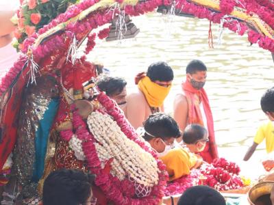 इसके बाद भगवान का विधि-विधान से पूजन व आरती की गई। भगवान महाकालेश्वर की सवारी कोरोना वायरस संक्रमण के मद्देनजर परिवर्तित मार्ग से निकाली गई। महाकालेश्वर मन्दिर से सवारी हरसिद्धि मन्दिर के सामने से होकर नृसिंह घाट पर झालरिया मठ होते हुए रामघाट पहुंची। रामघाट पर भगवान महाकालेश्वर का विधिवत पूजन-अर्चन पुजारी पं.आशीष गुरु द्वारा सम्पन्न कराया गया।