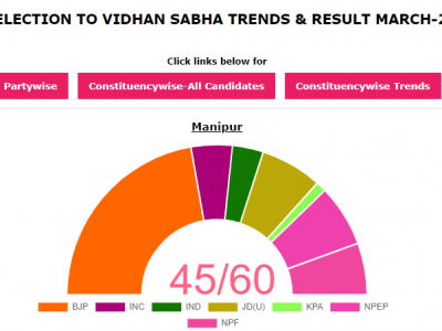 इम्फाल: मणिपुर की 60 सीटों के लिए गुरुवार सुबह 8 बजे से मतगणना जारी है। इस बार मणिपुर में दो चरणों में मतदान हुए थे। ऐसे में 28 फरवरी और 5 मार्च को जनता है चुनाव लड़ रहे उम्मीदवारों की किस्मत का फैसला कर दिया था। मणिपुर में सरकार बनाने के लिए किसी भी पार्टी को बहुमत के लिए 31 सीटों की जरूरत है। हालांकि, चुनाव आयोग द्वारा जारी किए गए ताजा आंकड़ों के अनुसार अभी तक 60 में से 45 निर्वाचन क्षेत्रों की ही स्थिति साफ हो पाई है।